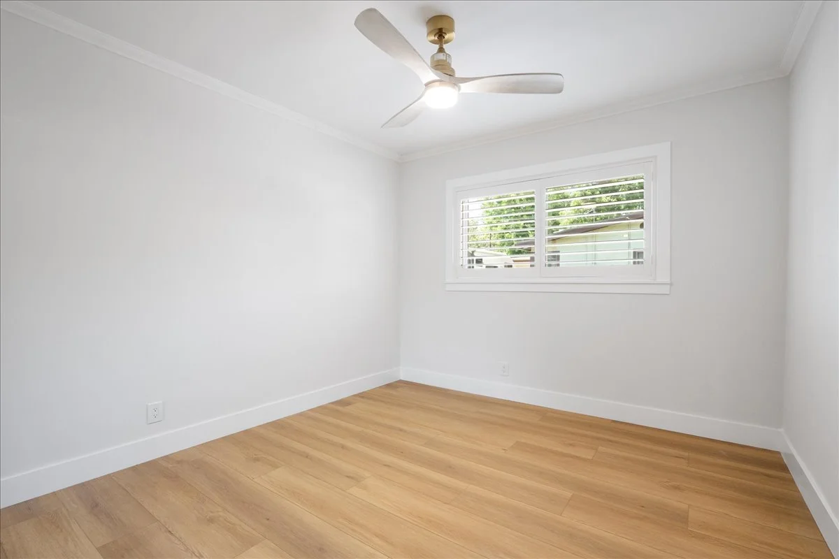 Home office with white walls, large window, dark rug, green chair, white curved desk, wall shelves, and gold ceiling fan.