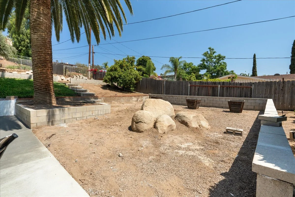 Backyard with a large tree on the left, a dirt area with rocks in the center, a concrete patio on the right, and a wooden fence in the background. There are two planters near the fence and various trees and bushes beyond.