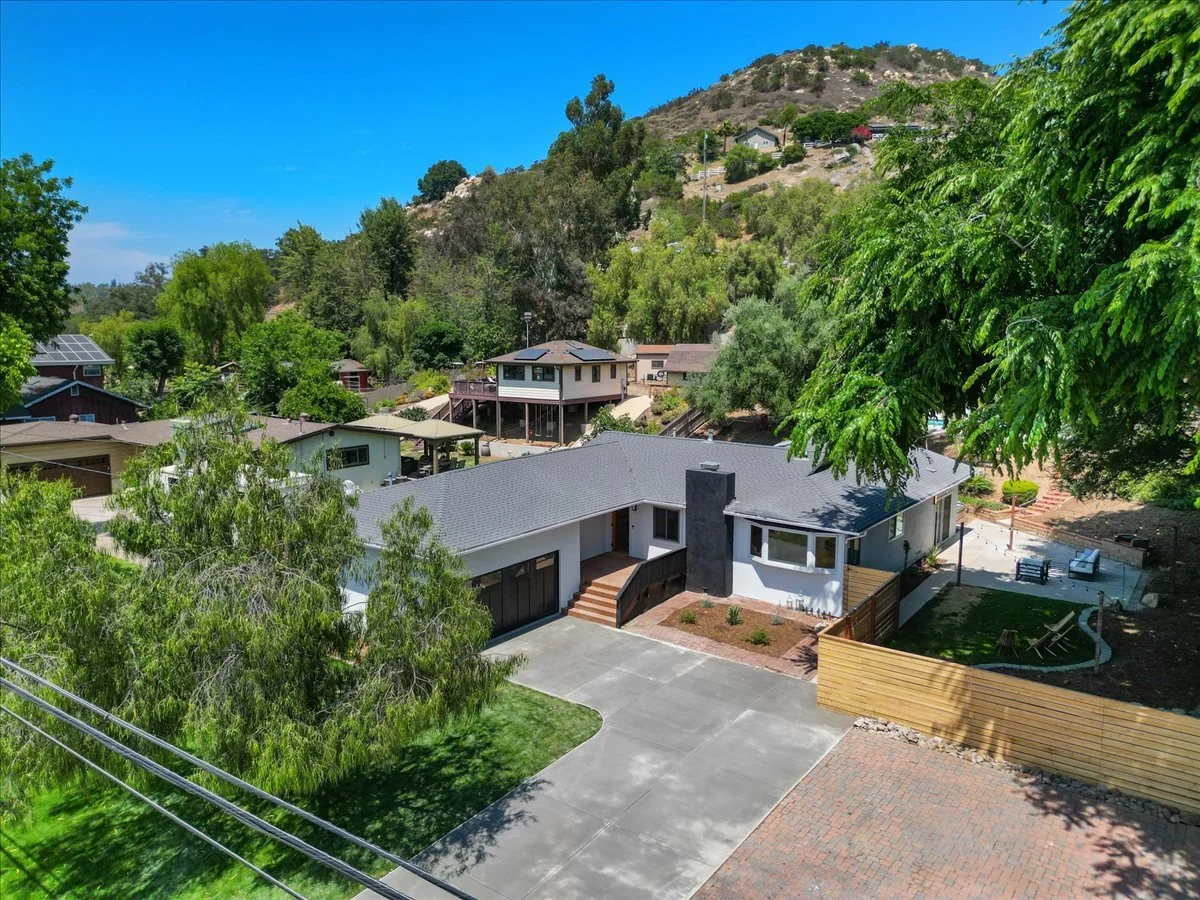 Aerial view of a residential neighborhood with houses, trees, a mountain in the background, and a blue sky.