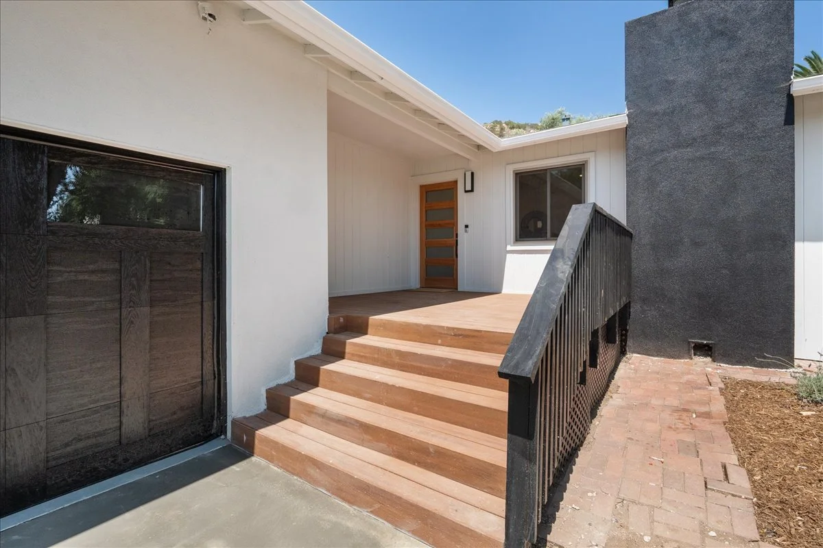 Modern house front entrance with wooden stairs, a garage door, a small porch, and a large window under a clear blue sky.