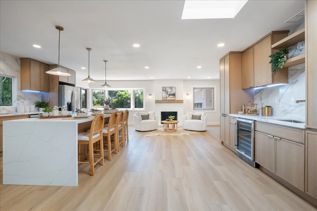 Living room with large sliding glass door, beige armchair, black coffee table, and a sofa, opening to an outdoor patio area. The kitchen and dining space are visible in the background with light wood floors, white walls, and modern furniture.