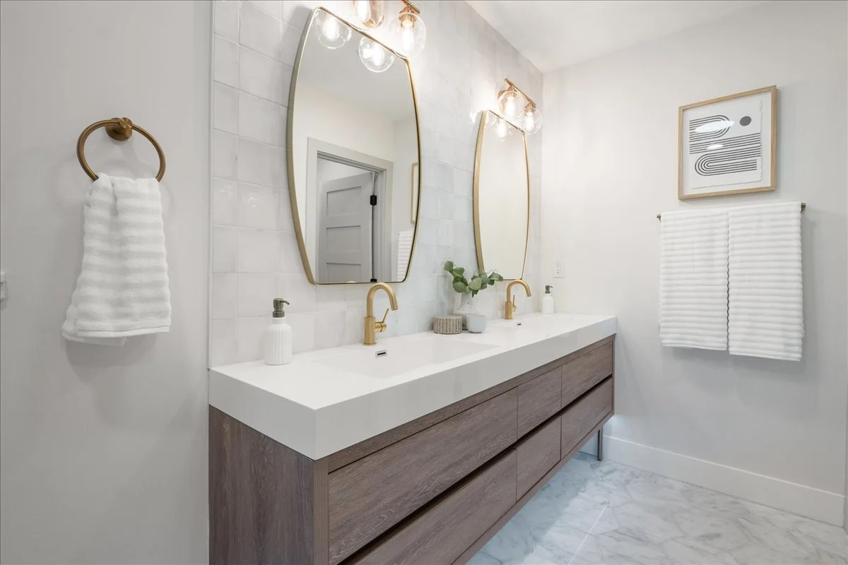 Primary bed & bath - while the bones of the room have remained, we cant say the same for the bathroom, the previous bathroom was taken down to the studs and doubled in size. The vision was to create a bathroom that can be used by more than one person at a time, from a private and separate water closet, to the double vanity and the best part is the large wet room with rain shower head and wand to the large soaking tub. We know life can be stressful, might as well have a safe space to go and unwind and enjoy the simple things in life.