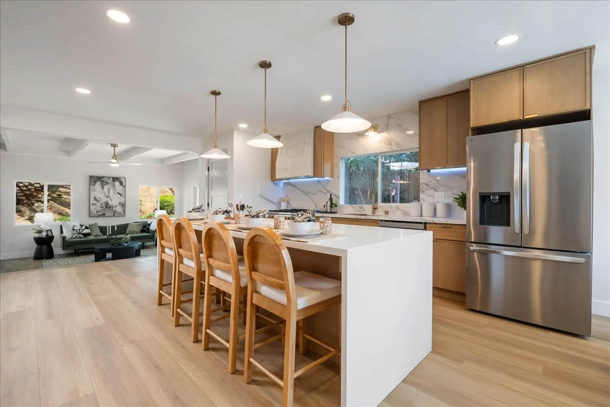 Kitchen - nothing in the previous kitchen remains, this space was completely reimagined and designed for functionality and entertaining. A large kitchen island with seating capacity was added, in the island a drawer microwave was installed as well as drawers - no cabinets in the island - we know that today’s families prefer to easily open a drawer versus digging through a dark hole of cabinets - as well as a built in trash and recycling. A new pantry was added, 36” gas range and custom built range hood added. The cherry on top is the built in wet bar with sink and wine fridge.